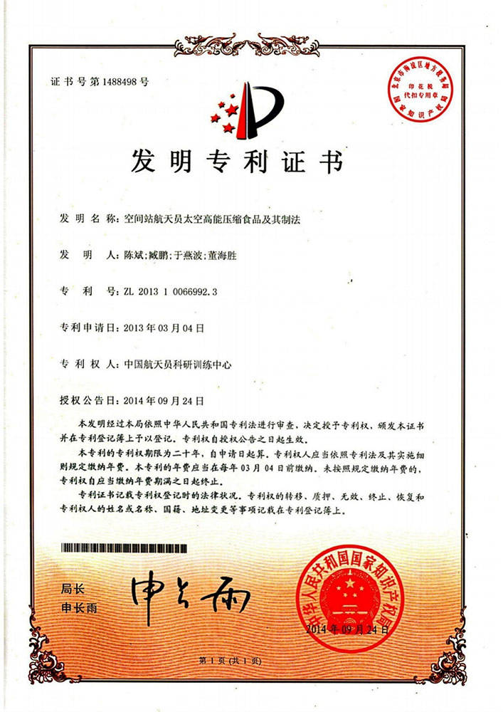 神舟太空食物高科技(深圳)无限公司独家具有中国航天员科研锻炼核心的空间坐航天员食物专利手艺——《空间坐航天员高能压缩食物及其制法》,专利号为ZL2。3。这一空间坐航天员食物专利手艺,正在特殊食物范畴意义不凡,享有独家法令,构成了的合作劣势。该专利手艺所涉及的产物,属于特殊食物范畴中的高能压缩食物。正在载人航天范畴,若航天员前往地面时无法快速获得搜救,需自行糊口一段时间。此时,能量高、体积小且照顾便利的食物就成为保障他们平安取健康的环节。高能压缩食物恰是满脚这一需求的抱负选择。